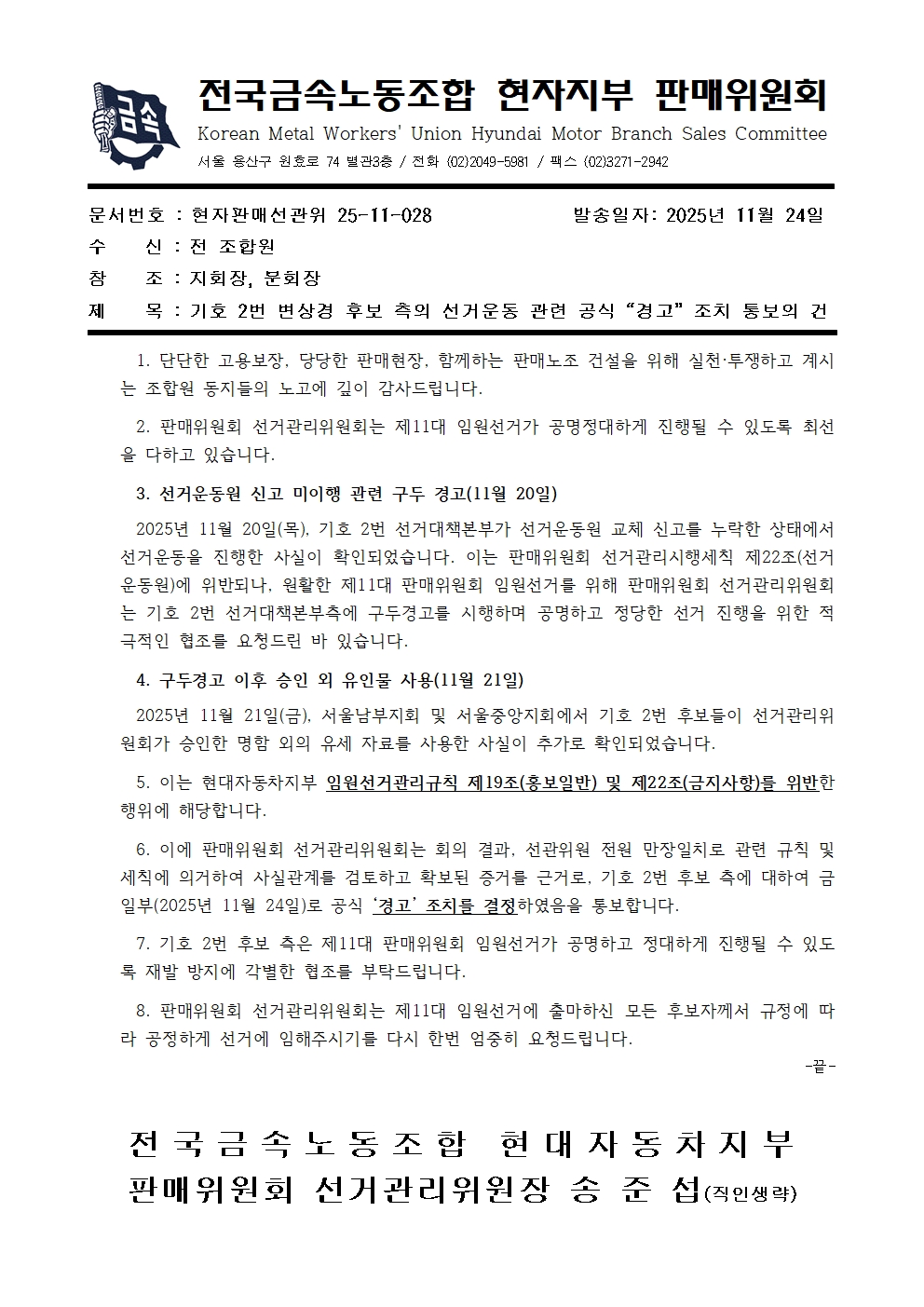 [¼±°üÀ§ °ø¹®] ±âÈ£ 2¹ø º¯»ó°æ Èĺ¸ ÃøÀÇ ¼±°Å¿îµ¿ °ü·Ã °ø½Ä "°æ°í" Á¶Ä¡ Å뺸ÀÇ °Ç