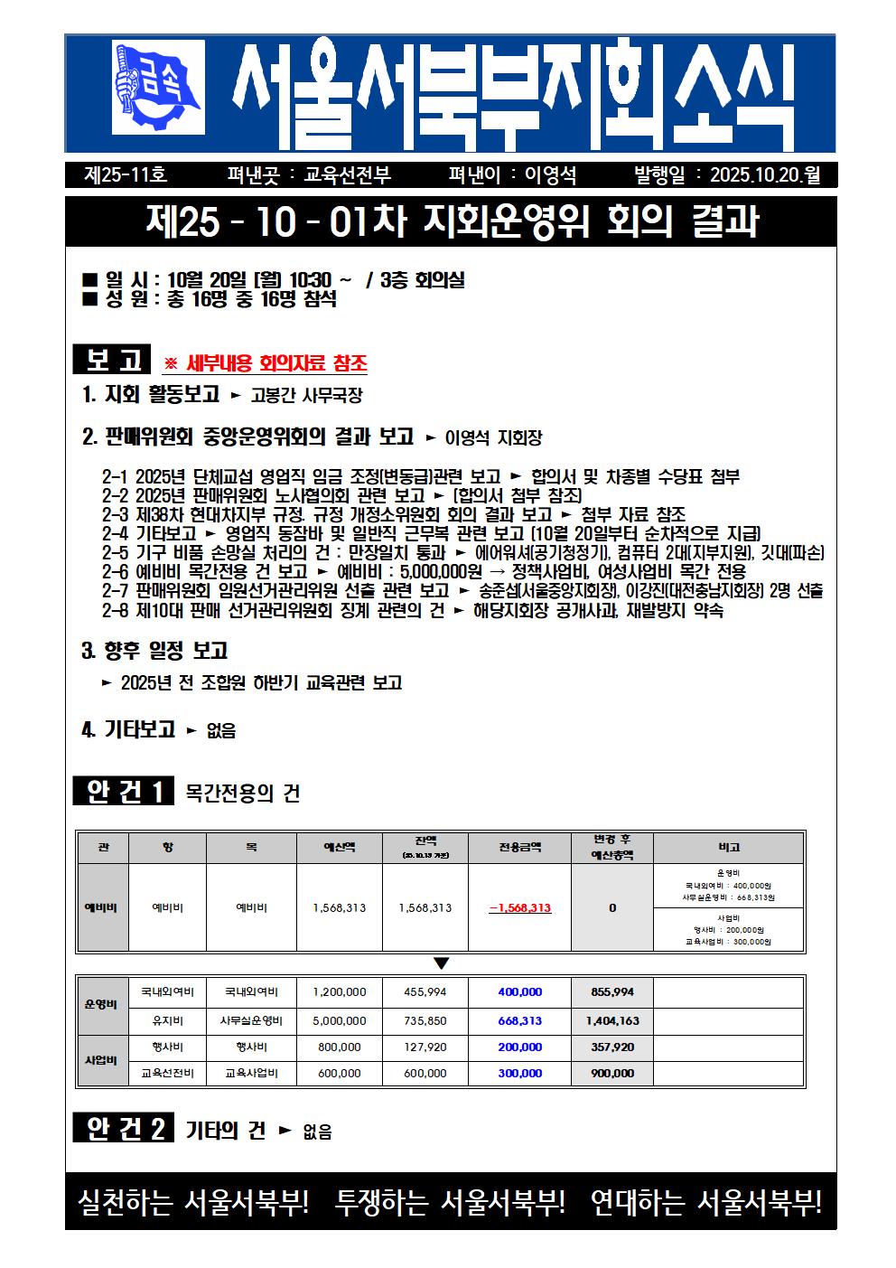 ¼Ò½Ä25-11] Á¦25-10-01Â÷ Áöȸ¿î¿µÀ§ ȸÀÇ °á°ú