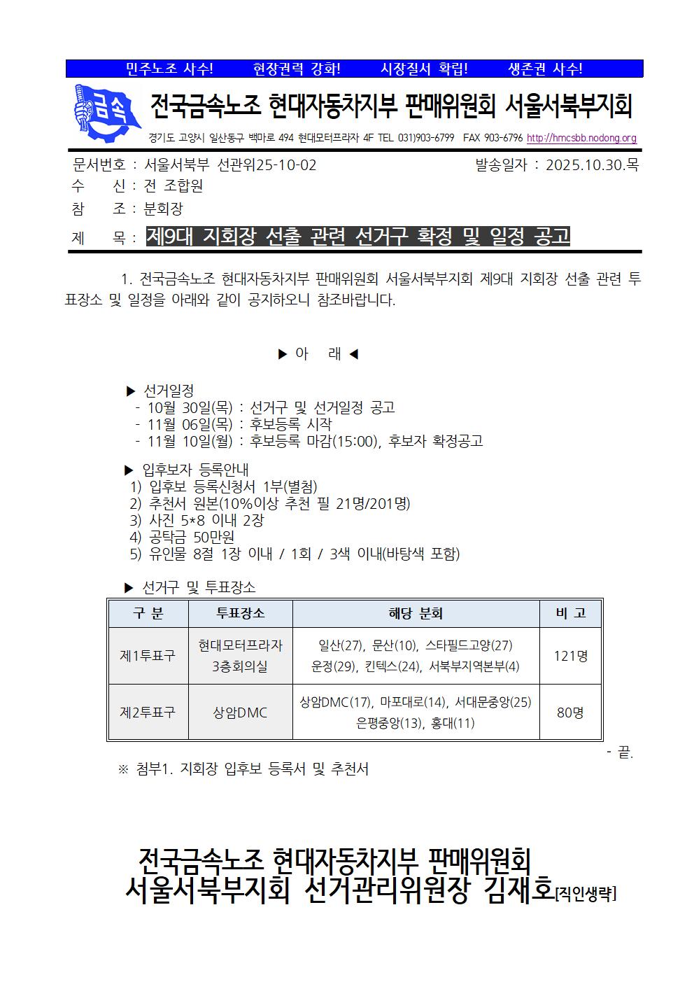 ¼±°üÀ§ 25-10-02 Á¦9´ë ÁöȸÀå ¼±Ãâ °ü·Ã ¼±°Å±¸ ¹× ÀÏÁ¤ È®Á¤ °ø°í.hwp (299.0K)