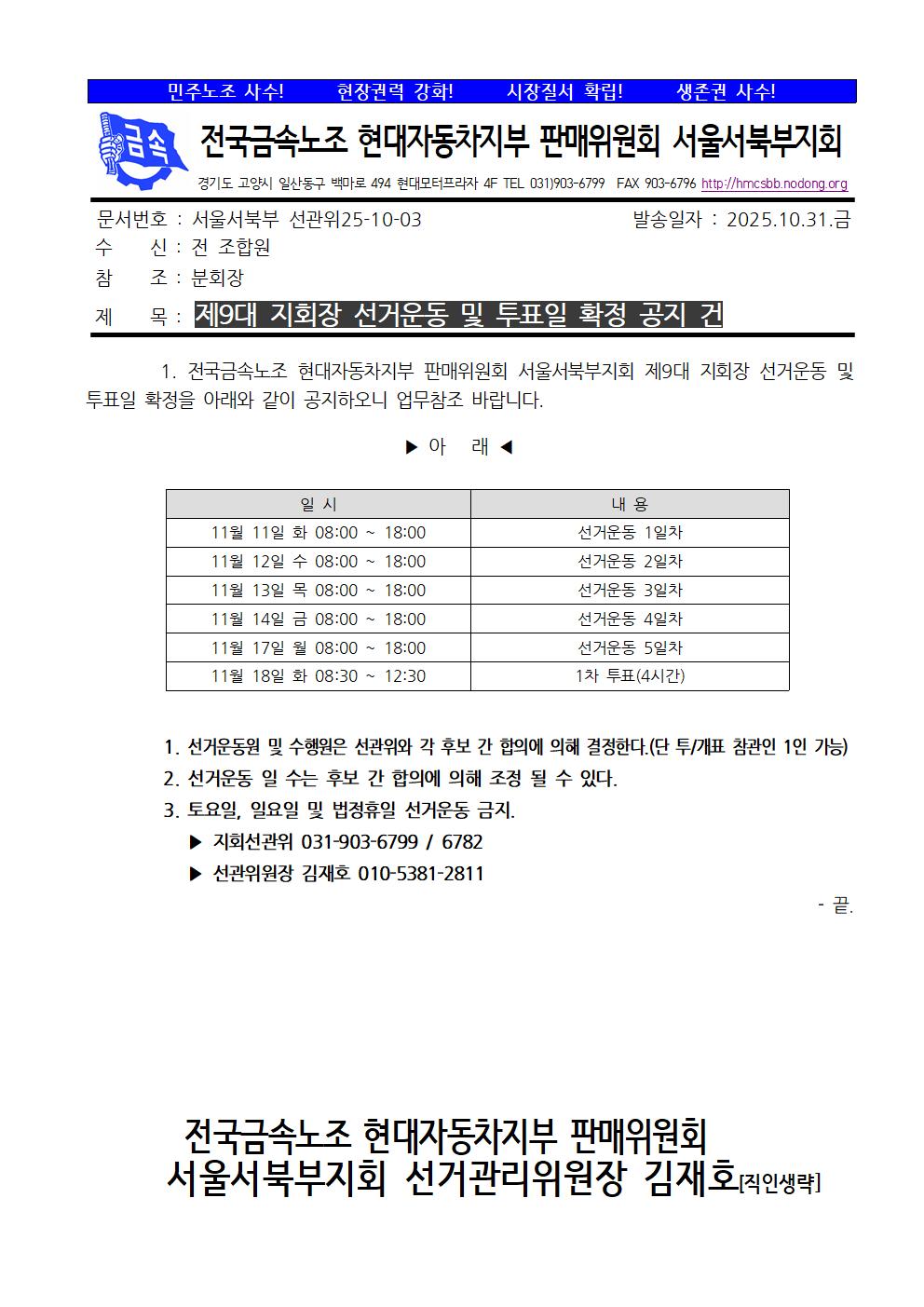 ¼±°üÀ§25-10-03] Á¦9´ë ÁöȸÀå ¼±°Å¿îµ¿ ¹× ÅõÇ¥ÀÏ È®Á¤ °øÁö °Ç