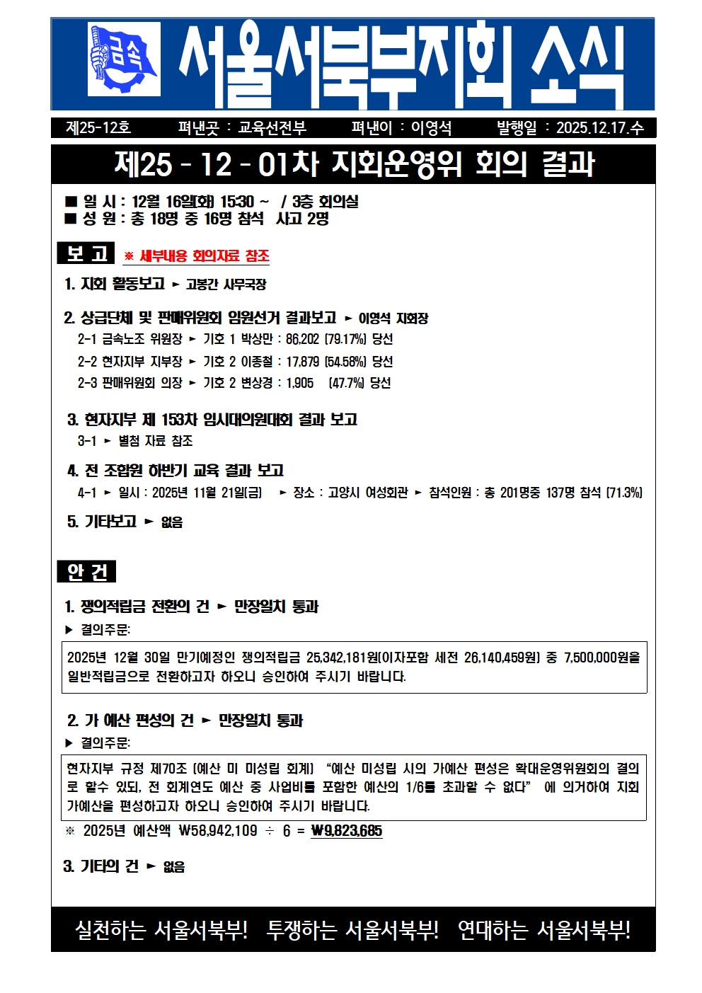¼Ò½Ä25-12] Á¦25-12-01Â÷ Áöȸ¿î¿µÀ§ ȸÀÇ °á°ú