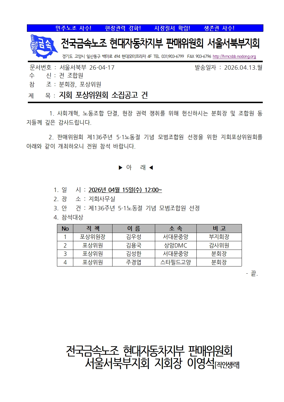 ¼¿ï¼ºÏºÎ 26-04-17 Áöȸ Æ÷»óÀ§¿øÈ¸ ¼ÒÁý °ø°í °Ç.hwp (290.0K)